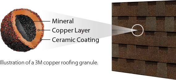 The Scotchgard™ Algae Resistant Roofing System by 3M uses advanced copper granule technology embedded directly into roofing shingles. These granules are coated with a ceramic layer containing copper oxide.