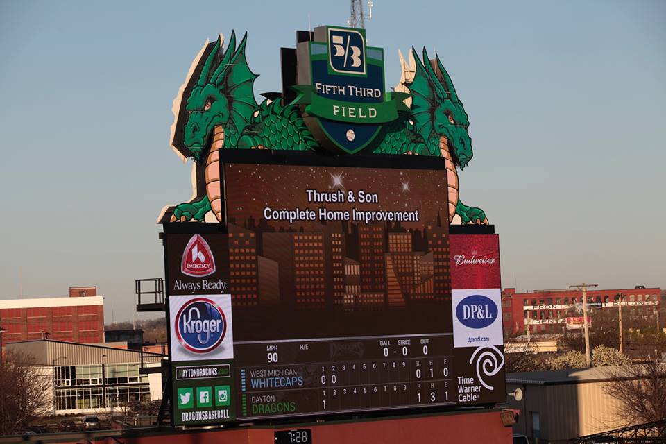 A massive scoreboard at Fifth Third Field features the mascots of the Class A Dayton Dragons and promotes Thrush and Son Complete Home Improvement.