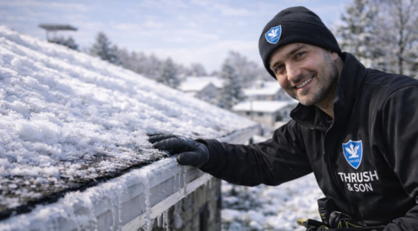 A winter-ready roof protected from ice dams with professional insulation and ventilation by Thrush & Son.
