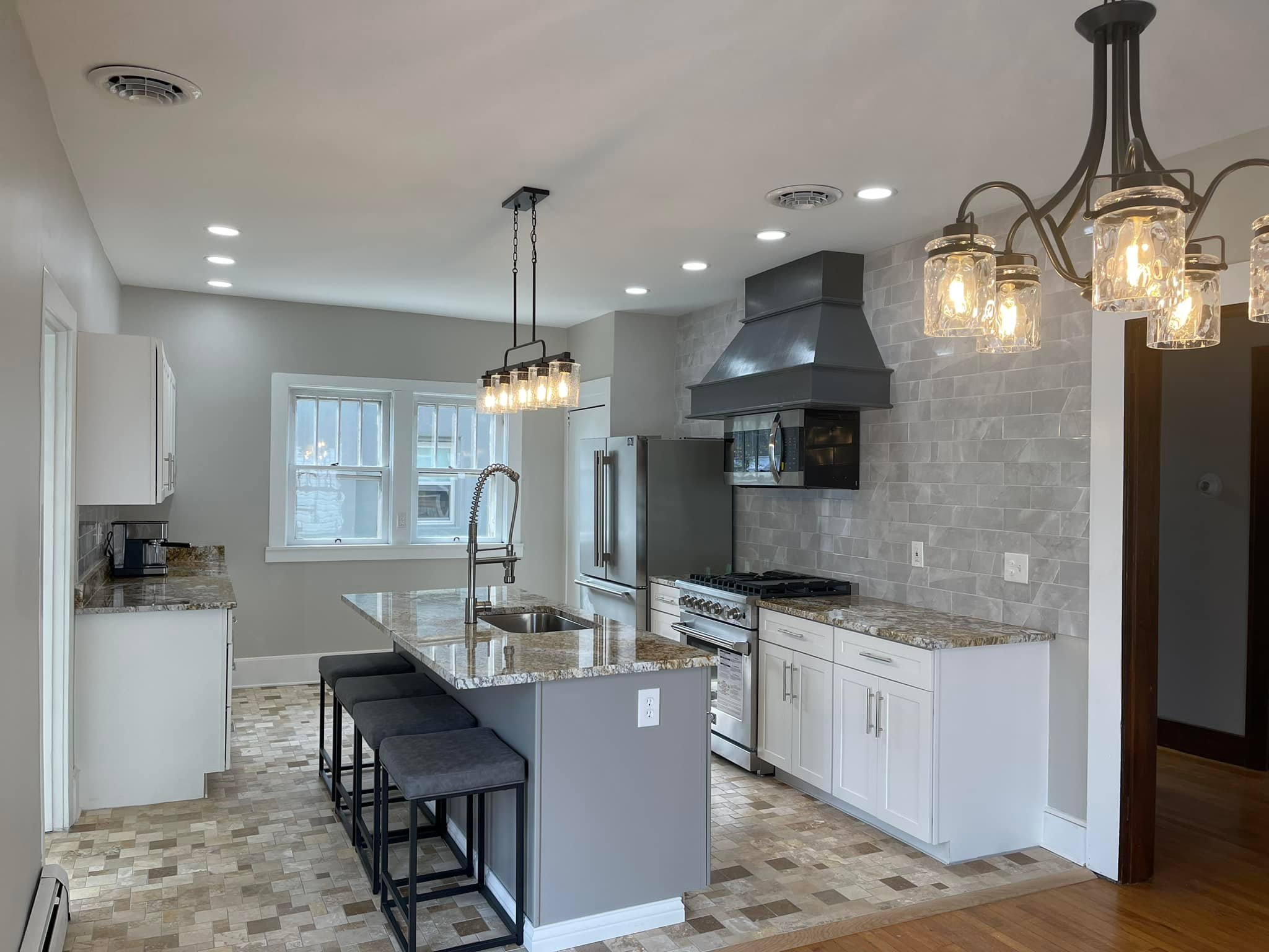 • Layered lighting — including Edison-style bulbs — adds warmth and character.